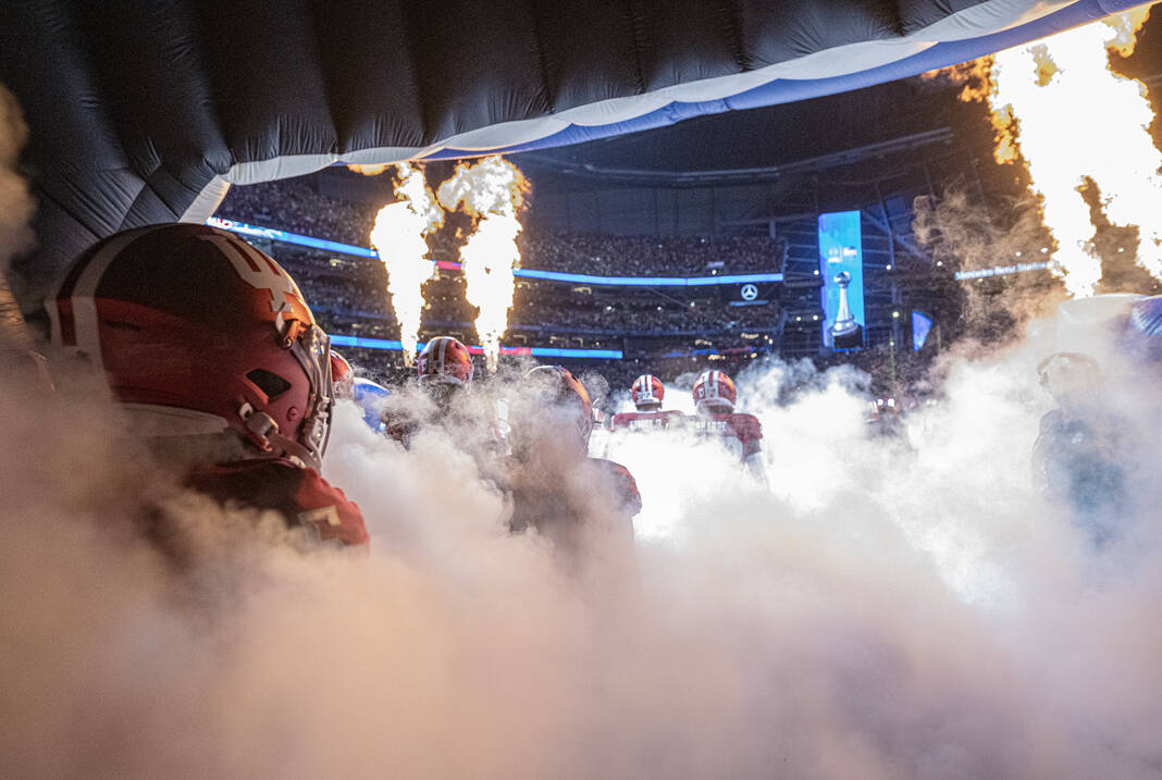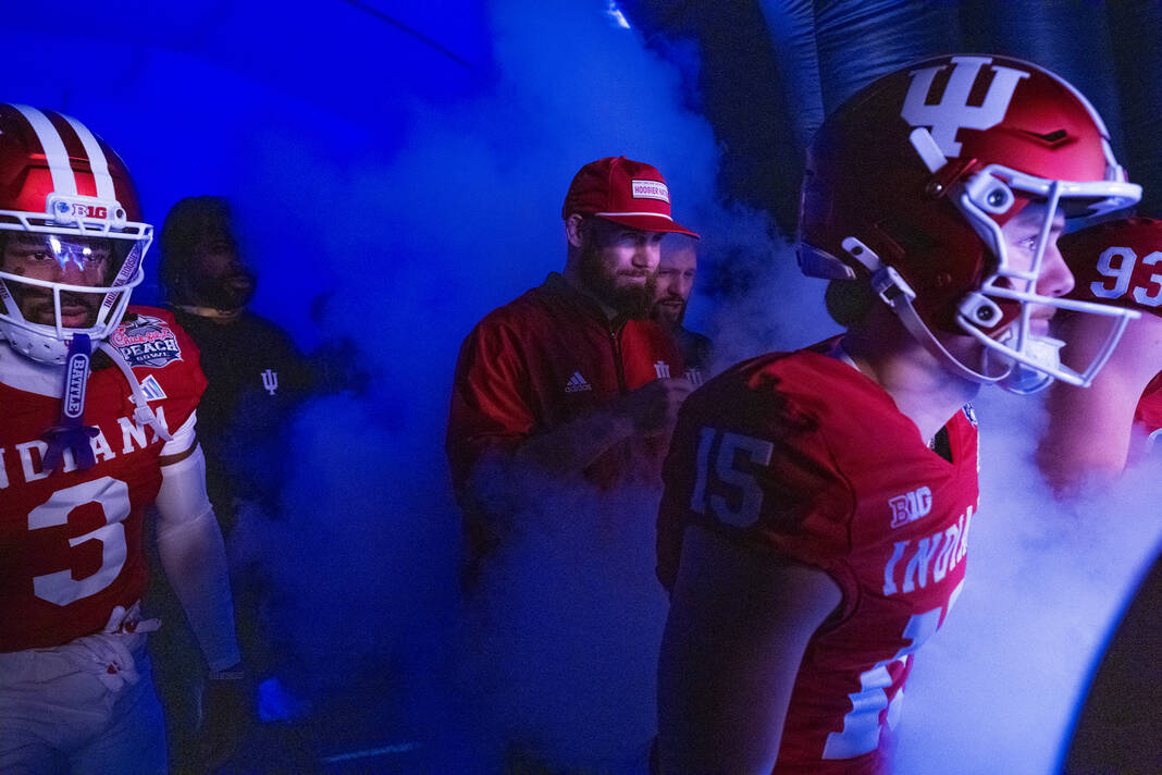 Indiana comes out of the tunnel in a patch of smoke before the start of Friday’s CFP semifinal Chick-Fil-A Peach Bowl in Atlanta.