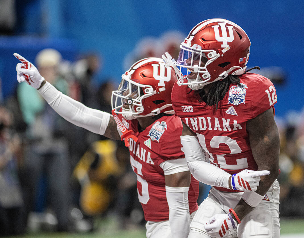 Indiana’s D’Angelo Ponds and Devan Boykin celebrate Ponds interception for a touchdown on the first play against Oregon at the start of Friday’s CFP semifinal Chick-Fil-A Peach Bowl in Atlanta.