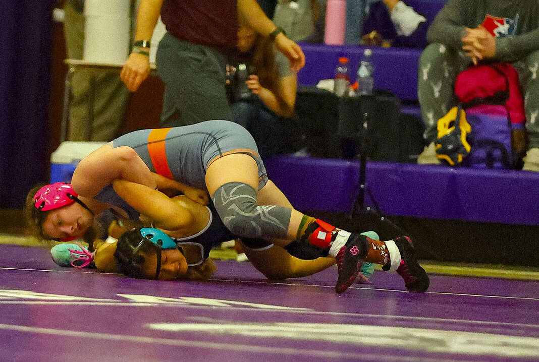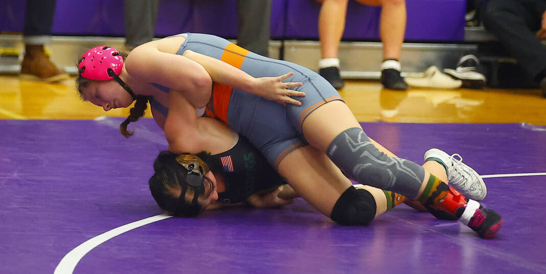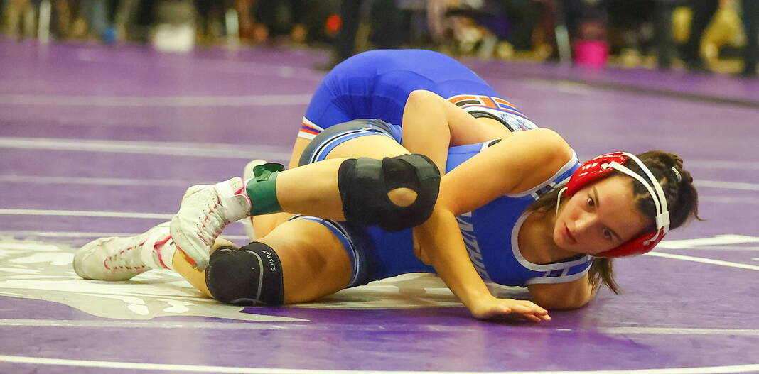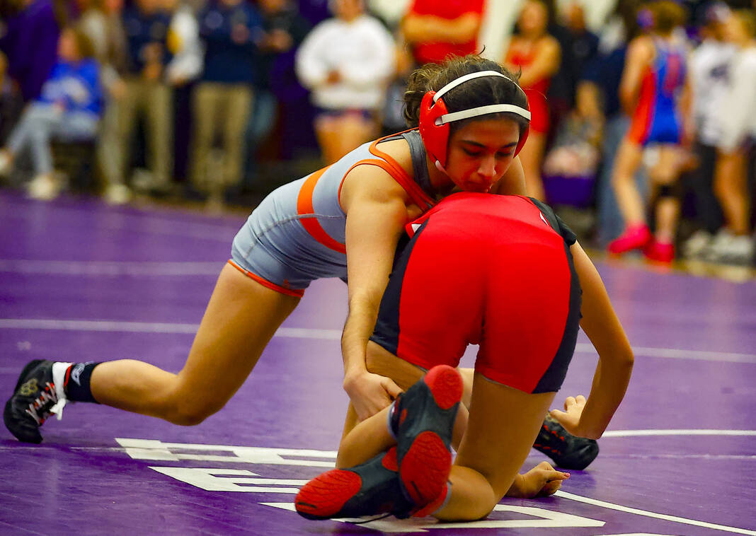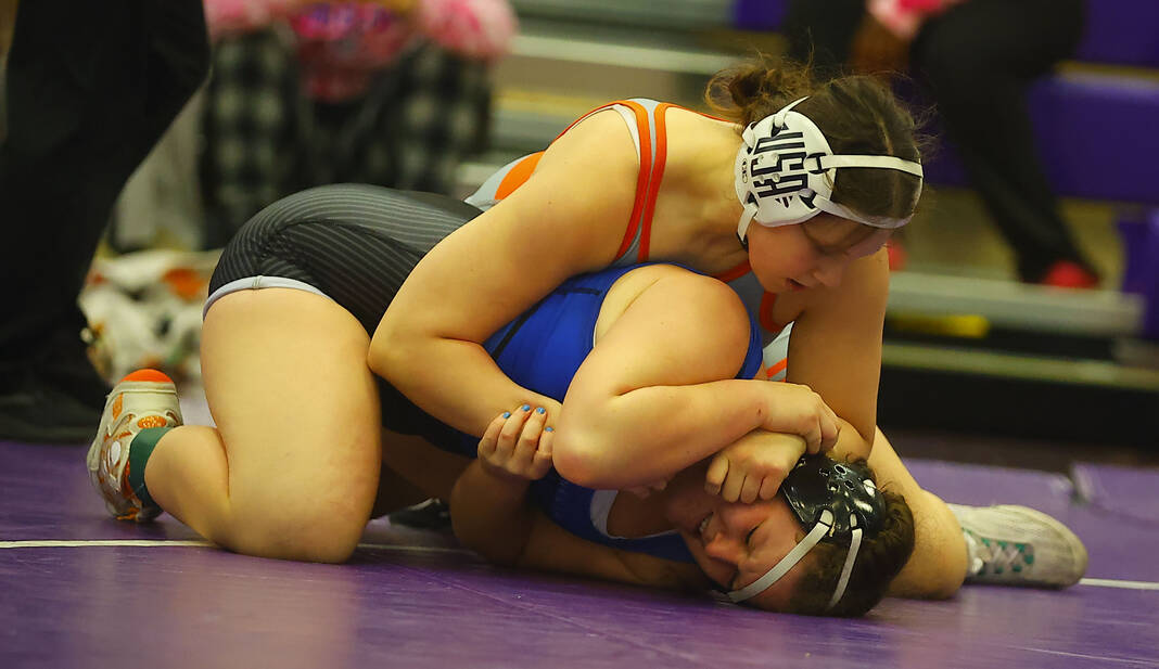 Columbus East’s Gloria Cloud goes for a pin on Monrovia’s Kaylee Williams in a 120-pound match at Saturday’s Bloomington South Regional.