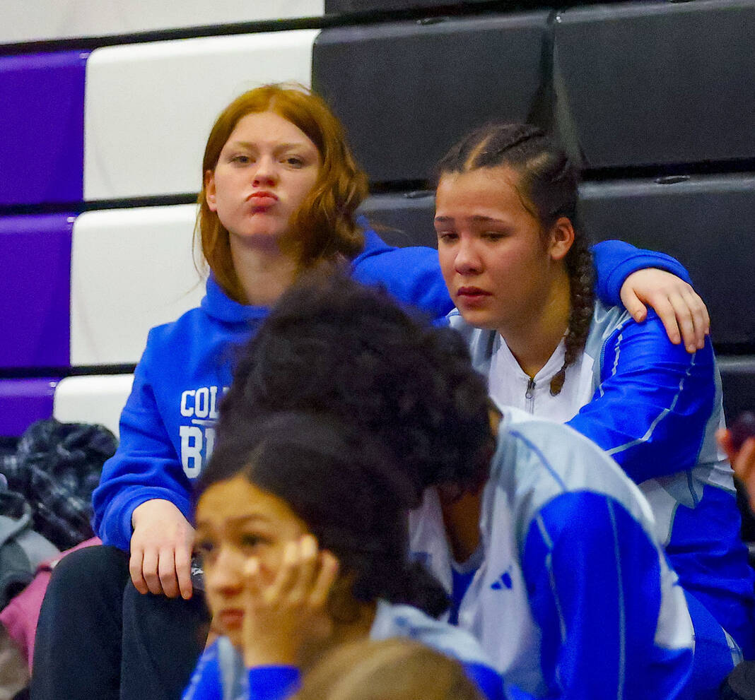 Columbus North’s Zahlynn Williams (R) is consoled by a teammate after losing in the first round in a 170-pound match against Jennings County’s Gabrella Hernandez at Saturday’s Bloomington South Regional.