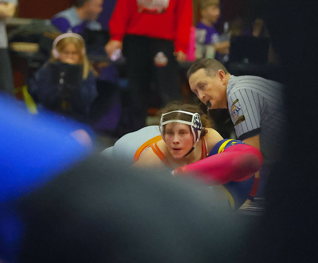 Columbus East’s Annie Redman looks to the corner for help against Mooresville’s Baylee Blackwell in a 170-pound match at Saturday’s Bloomington South Regional.