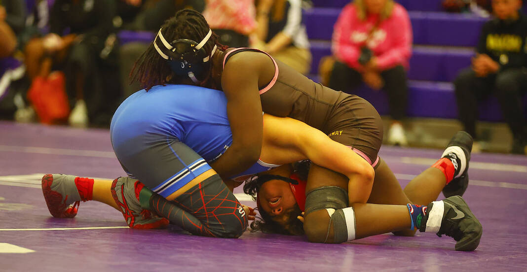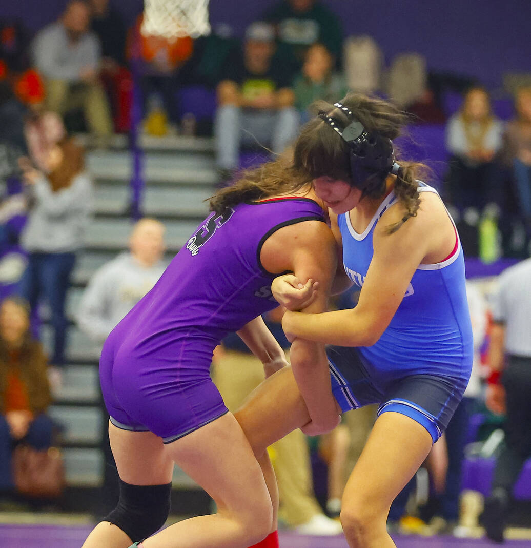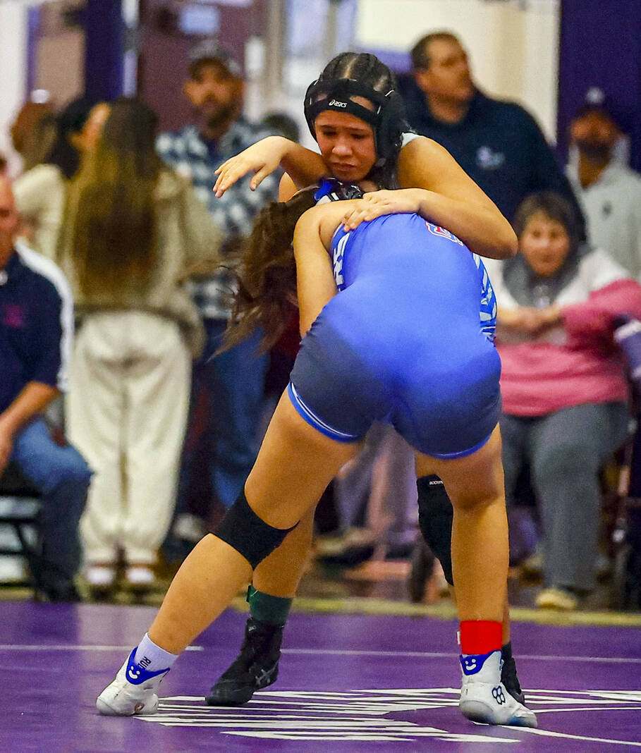Columbus North’s Zahlynn Williams locks up with Jennings County’s Gabrella Hernandez in a 170-pound match at Saturday’s Bloomington South Regional.