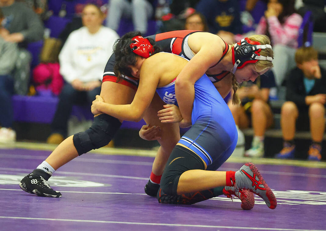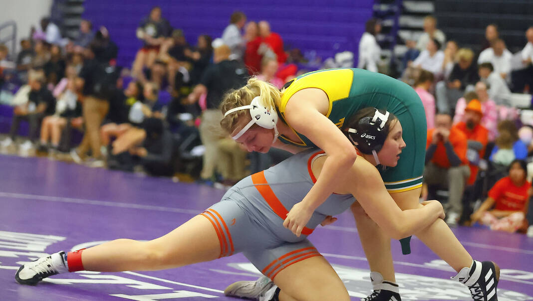 Columbus East’s Annie Redman gains control of Franklin’s Eleanor Robertson in a 170-pound final at Saturday’s Bloomington South Regional.