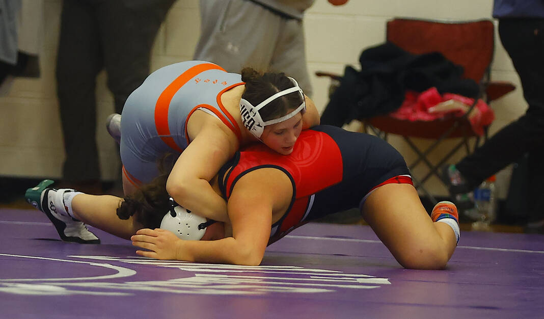Columbus East’s Annie Redman goes for a takedown on Floyd Central’s Dani Ashby in a 170-pound match at Saturday’s Bloomington South Regional.