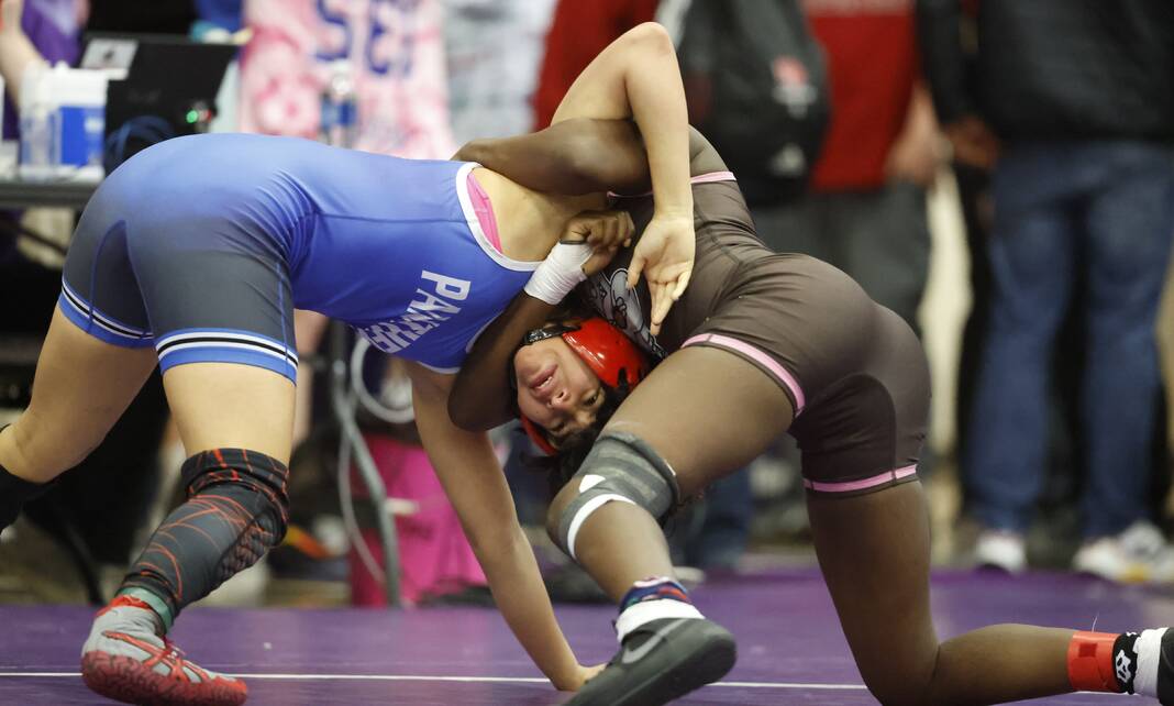 Columbus East’s Tienica Dits tries for a takedown of Cardinal Ritter’s Jocelyn Flores Gaspar in a 105-pound match at Saturday’s Bloomington South Regional.
