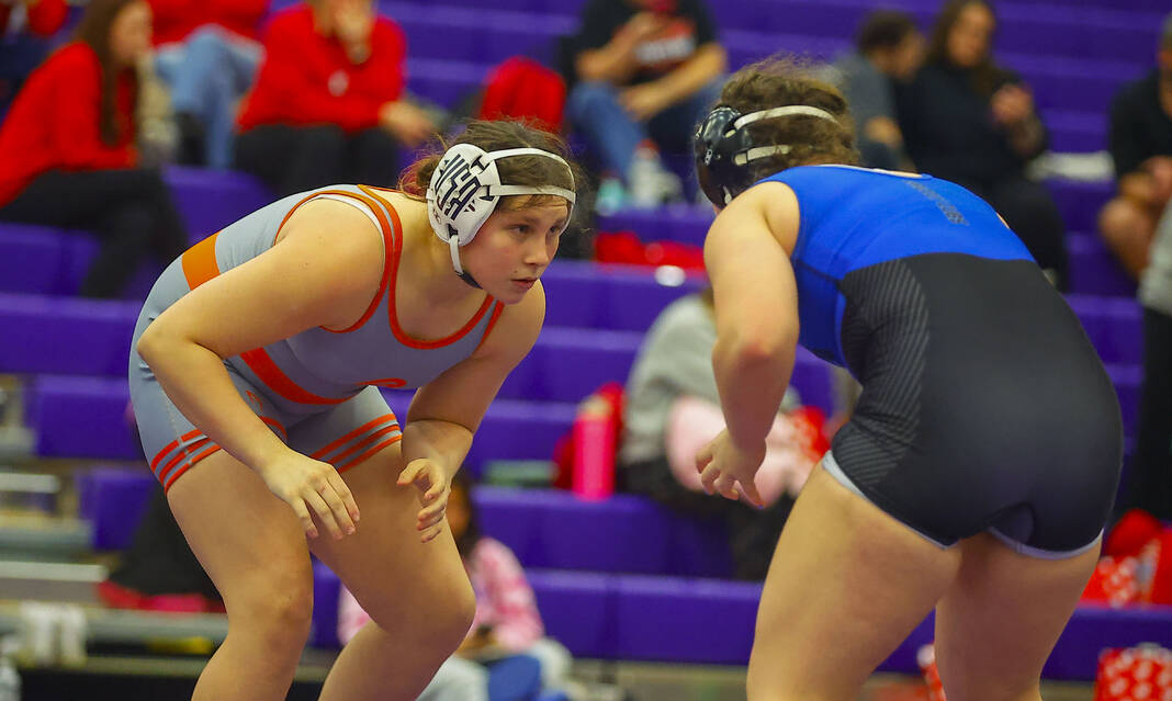 Columbus East’s Annie Redman gets ready to lock up with Franklin’s Eleanor Robertson in a 170-pound final at Saturday’s Bloomington South Regional.