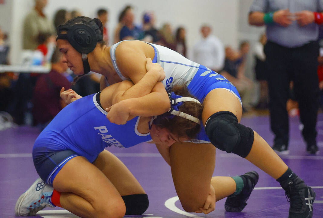 Columbus East’s Tienica Dits, left, locks up with North Posey’s Desirae Reese in a 105-pound match at Saturday’s Bloomington South Regional.