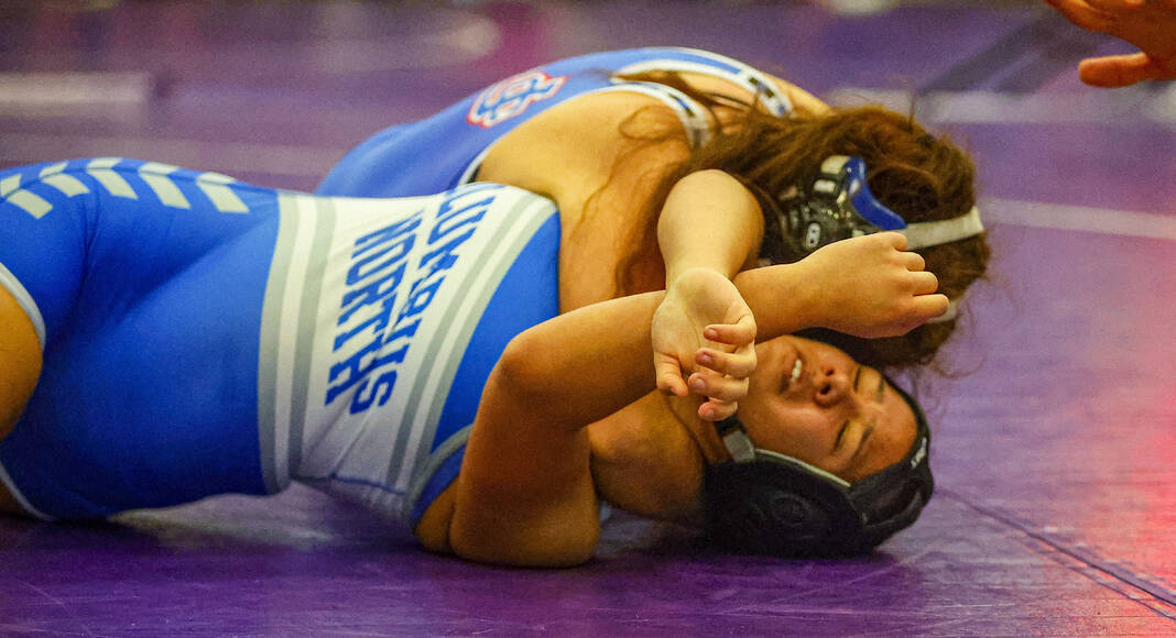 Columbus North’s Zahlynn Williams and Jennings County’s Gabrella Hernandez battle in a 170-pound match at Saturday’s Bloomington South Regional.