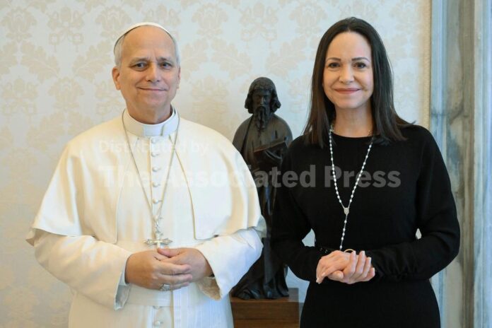 ROME (AP) — Pope Leo XIV met with Venezuelan opposition leader and Nobel Peace Prize winner María Corina Machado in a private audience at the Vatican on Monday, during which the Venezuelan leader asked him to intercede for the release of hundreds of political prisoners held in the Latin American country.