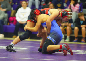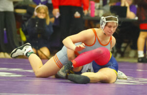 Columbus East’s Annie Redman controls Mooresville’s Baylee Blackwell in a 170-pound match at Saturday’s Bloomington South Regional.