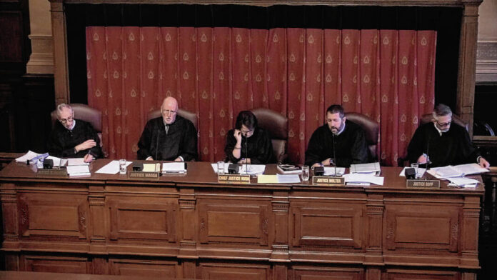 Indiana Supreme Court Justice Derek R. Molter, second from right, asks a question Thursday during oral arguments for an appeal as part of a victims lawsuit against the Greenwood Park Mall for the 2022 mass shooting.