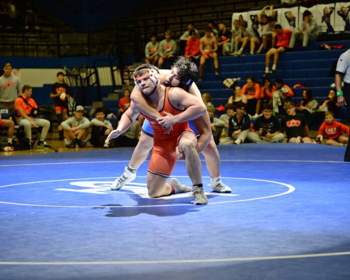 Columbus East’s Hank Redman and Columbus North’s Servando Lozano grapple during a 285-pound match Wednesday in Memorial Gymnasium at Columbus North High School. Tommy Walker/For The Republic