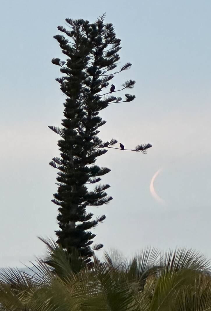 Greg Scherschel of Columbus caught this shot of the sliver of a new moon alongside a large Cook pine tree during a recent stay on Sanibel Island, Fla. Note the large ospreys or sea hawks perched on the tree.