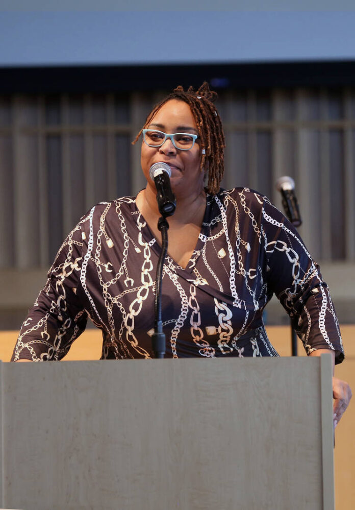 Carla Clark | For The Republic Whittney Wood-Gaines gives the community announcements for Black History Month during the 2025 Community Church Service hosted by the African American Pastor’s Alliance for Black History Month at the Commons, Columbus, Ind., February 2, 2025.
