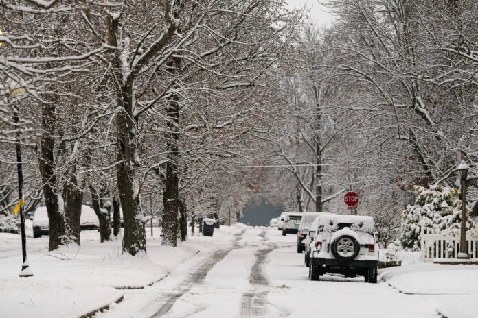 Mike Wolanin | The Republic Snow covers the ground and vehicles on Caldwell Place in Columbus, Ind., Tuesday, Dec. 3, 2025.