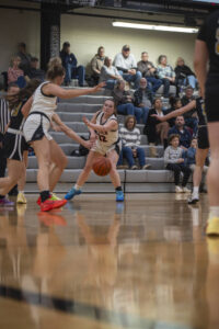 Hauser’s Leah Manley (32) passes to June Berkenstock (2) against Morristown Thursday at Hauser High School.