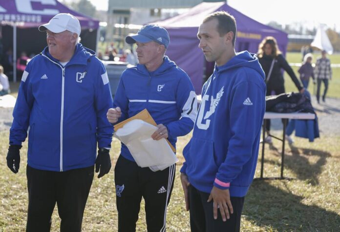 Columbus North head cross-country coach Rick Sluder, center, talks with assistant coaches Rick Weinheimer, left, and Kyle Burton before the start of the Cross Country State Finals Nov. 2, 2024 at LaVern Gibson Championship Cross Country Course in Terre Haute.