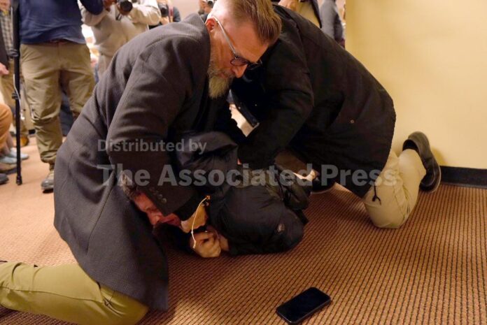 MINNEAPOLIS (AP) — A man sprayed an unknown substance on U.S. Rep. Ilhan Omar before being tackled to the ground Tuesday during a town hall she was hosting in Minneapolis, where tensions over federal immigration enforcement have come to a head after agents fatally shot an intensive care nurse and a mother of three this month.