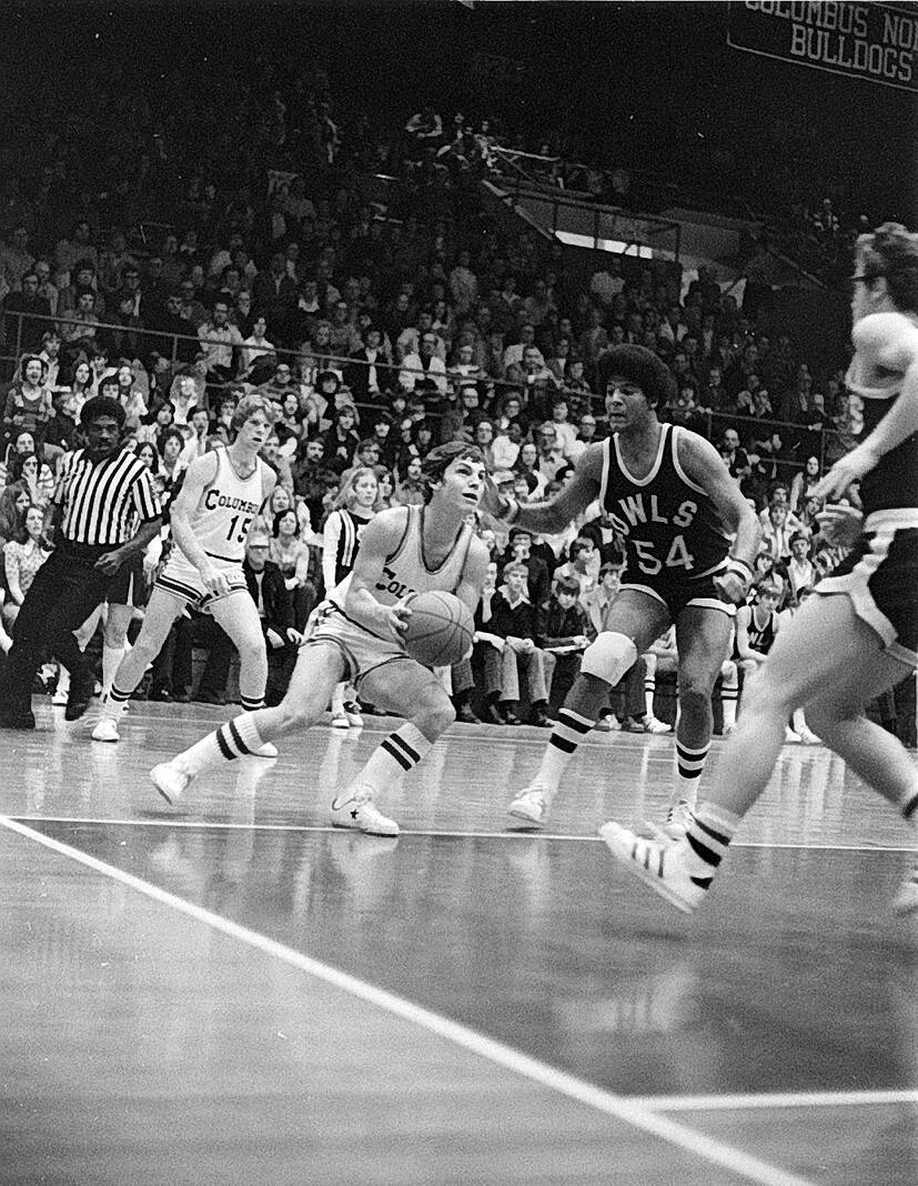 Columbus North’s Craig Thayer, with the ball, avoids Seymour’s Bo McDougal (54) and drives toward the basket during North’s 68-67 victory over the Owls on Jan. 30, 1976. Thayer scored 16 points.