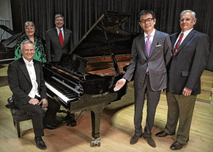 With the new Shigeru Kawai EX Concert Series Grand Piano in Indianapolis on Feb. 2, 2016, are, from left, Columbus Indiana Philharmonic Music Director David Bowden, Philharmonic Executive Director Margaret Powers, Philharmonic Board President Pete King, Enkei America President Makoto Miura, and Enkei America Chief Operating Officer Rick Merkel.