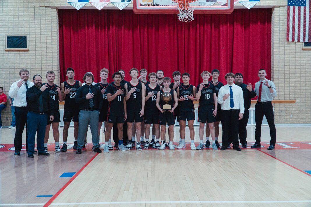 The Hauser boys basketball team celebrates its third consecutive outright Mid-Hoosier Conference title following Thursday’s win at Southwestern (Shelby).
