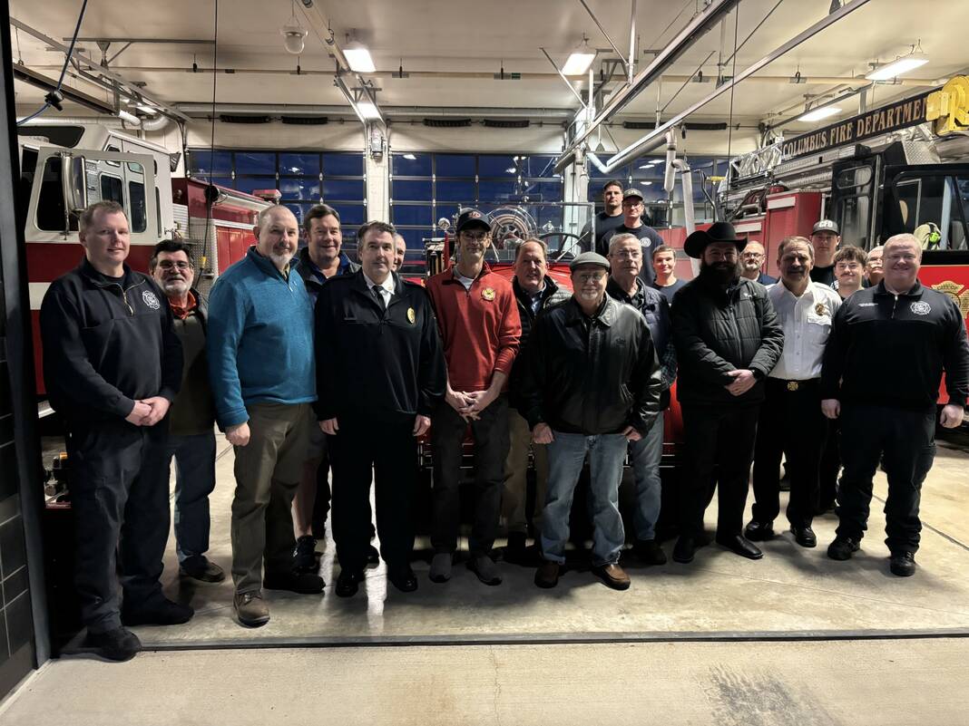 Photo provided Columbus Elks Lodge #521 leaders and Columbus firefighters gather at Columbus Fire Department Station 2 for a check presentation from the Elks Lodge in support of the Timothy B. Perry Memorial Fund to support first responder mental health and wellness.