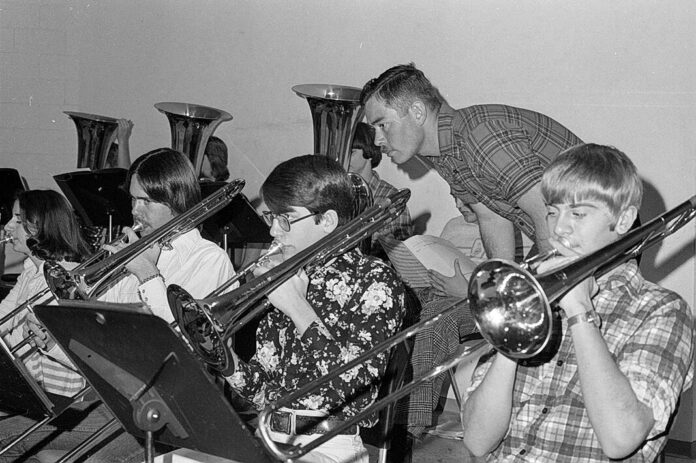 U.S. Marine Staff Sgt. Gary Nease offers pointers to Columbus East High School bandsmen on Feb. 6, 1976, after a concert and rehearsal at East by the Second Marine Aircraft Wing Band.