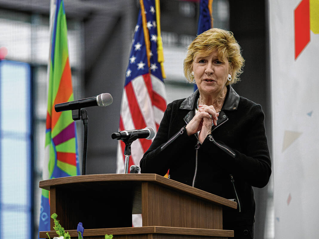 Mike Wolanin | The Republic Columbus Mayor Mary Ferdon delivers the annual State of the City address in the Circle K Fieldhouse at NexusPark in Columbus, Ind., Wednesday, Feb. 19, 2025.