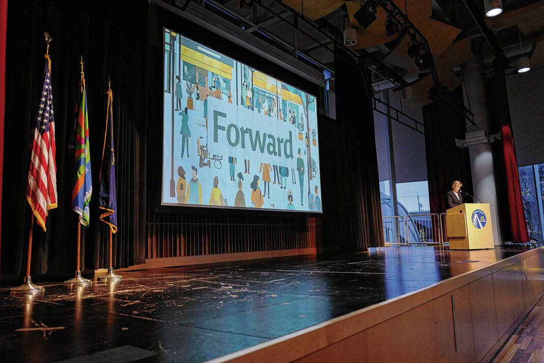 The state of the city is strong, the mayor said standing at a lectern inside The Commons, and she marked the evening’s theme as looking “forward” to what’s to come for the community on housing, homelessness, economic development, redevelopment and transportation, among other areas.