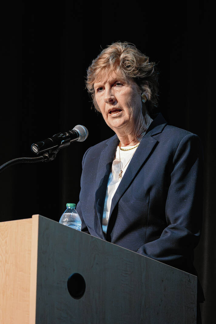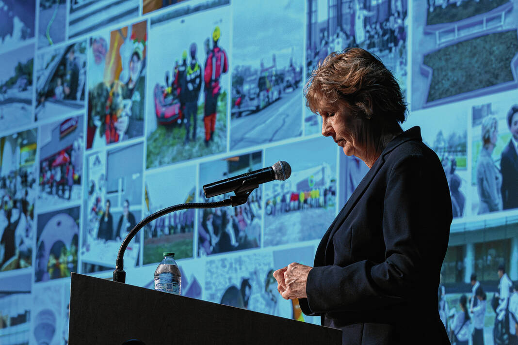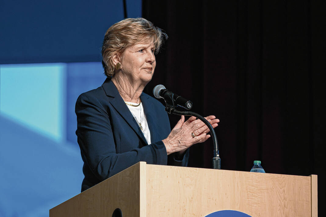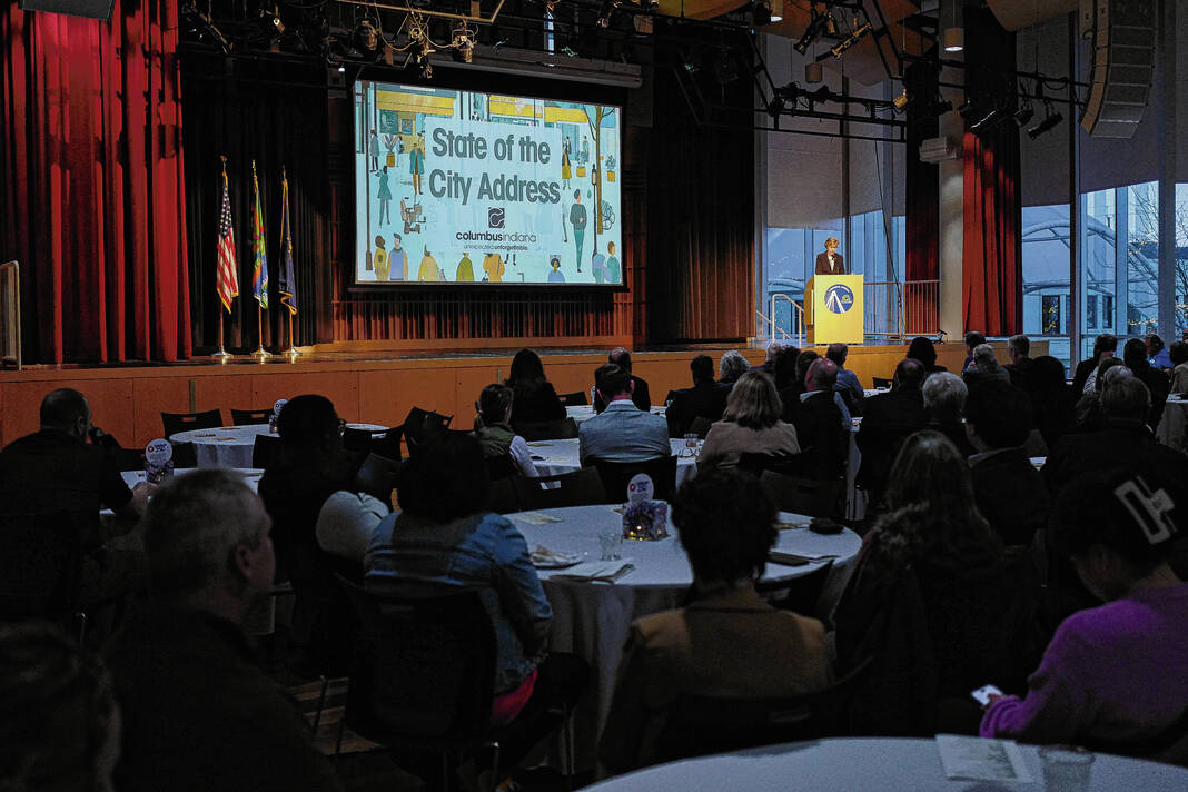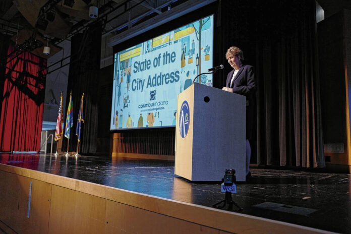 Mike Wolanin | The Republic Columbus Mayor Mary Ferdon delivers the State of the City address at The Commons in Columbus, Ind., Tuesday, Feb. 10, 2026.