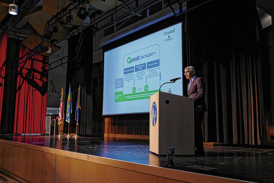 After Srikanth Padmanabhan, a retired Cummins executive and community leader, gave an overview of Quest, a visioning process that looks to adopt a shared vision of the future of Columbus out to 2050, the mayor left off by recognizing the United States’ semiquincentennial — or 250th birthday this July by invoking the founders.