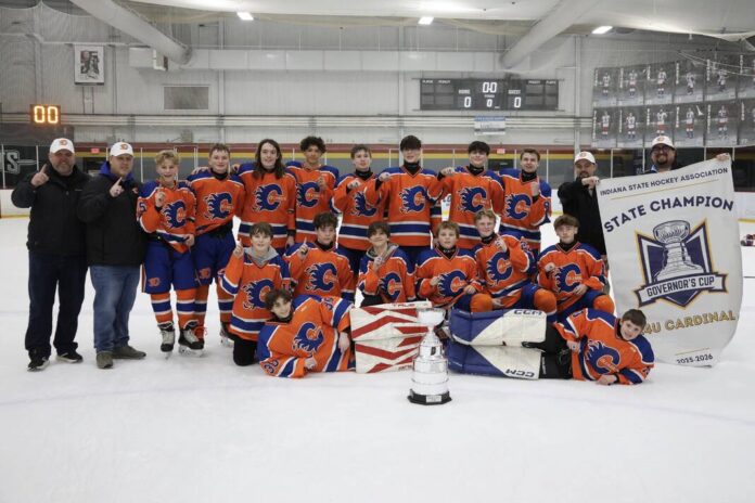 The Columbus Flames 14U Blue team won the Cardinal Division at the Indiana State Governors Cup Sunday at the Fuel Tank in Fishers. Team members include, front row from left, Emmett Cassidy, Cayden Long; second row, Lukas Jozsa, Carter Harris, Owsley Powers, Daniel Wallace, Nolan Sparkman, Bentley Hampton; and back row, assistant coaches Steve Long and Todd Sims, Carsen Sims, Will Hart, Sam Olson, Ben Scott, Caleb Peterson, Logan Barringer, Merik Baytala, Luke Getchell, assistant coach Ryan Ingalls and head coach Noah Carlock.