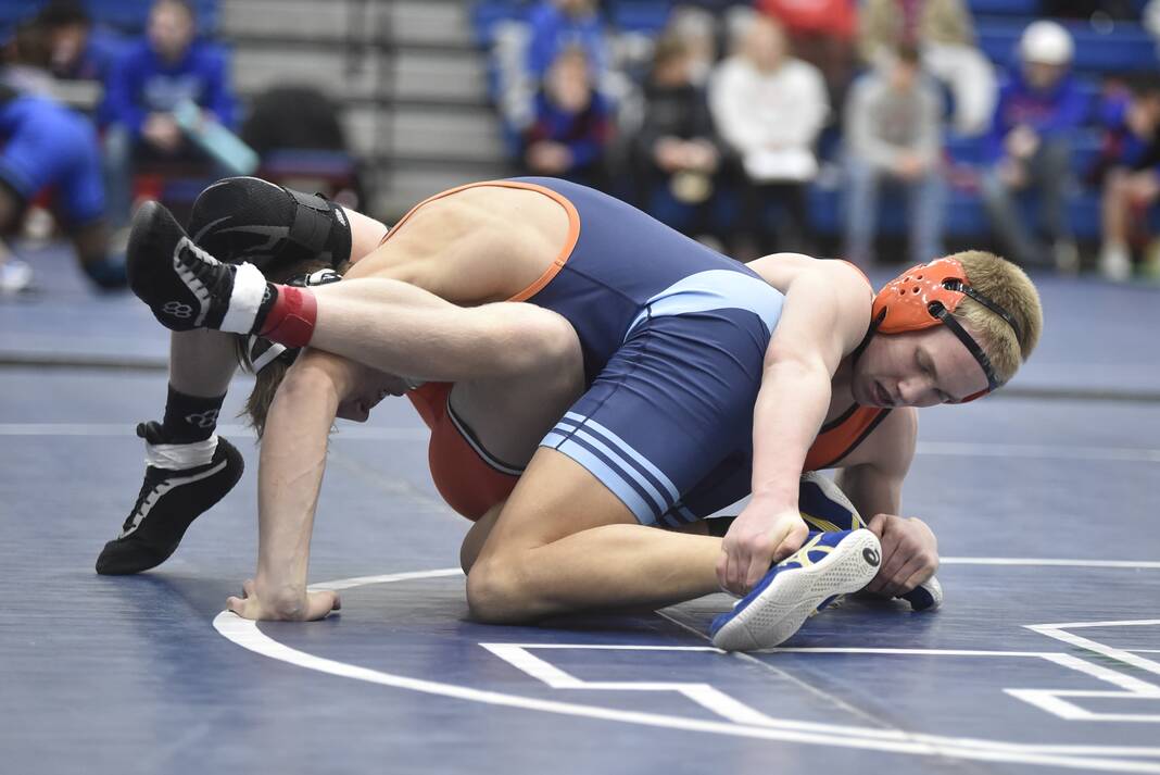 Columbus East’s Ethan Poling, facing, battles Switzerland County’s Ethan Rose in the 132-pound final Jan. 31 in the Jennings County Sectional.