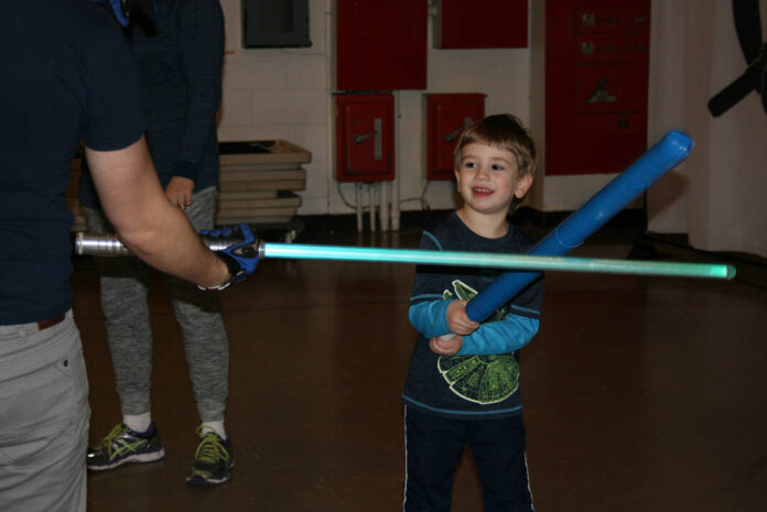Nathan Booth practices using a lightsaber on Feb. 6, 2016. Star Wars fans in the Columbus Autism Network were treated to lightsaber training, where participating families learned basic skills from Indy Lightsaber Academy trainers.
