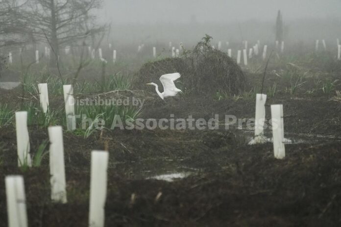 MERAUX, La. (AP) — Across the calm waters behind a pumping station near Lake Borgne, hundreds of saplings stand out in the mist, wrapped in white plastic cylinders.