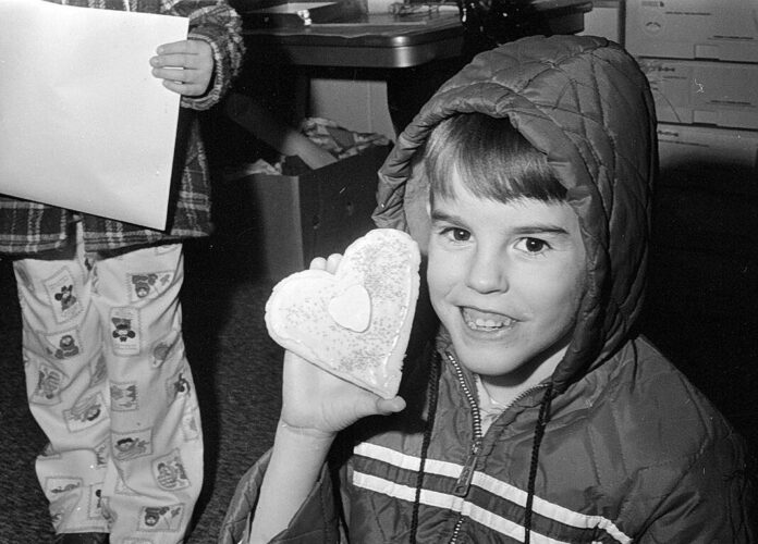 Valentine cookies and heart-shaped candy brought smiles to Richards Elementary School student Scot Selig on Feb. 14, 1976.