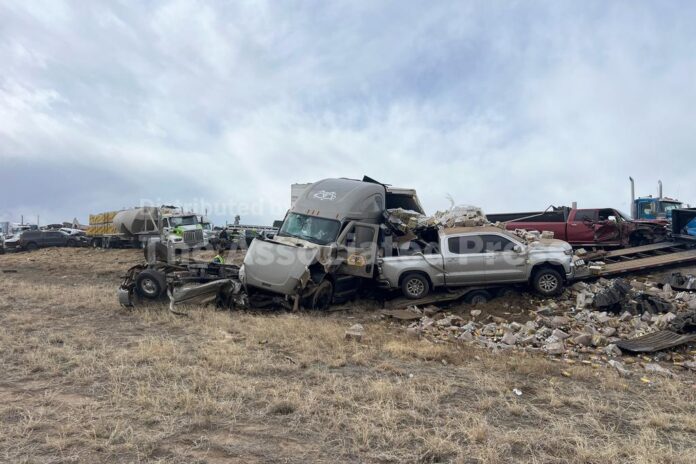 Dirt kicked up by heavy winds caused “brown out” conditions at the time of the pileup on Interstate 25 south of Pueblo around 10 a.m. the Colorado State Patrol said. It said drivers had “low to no visibility.”