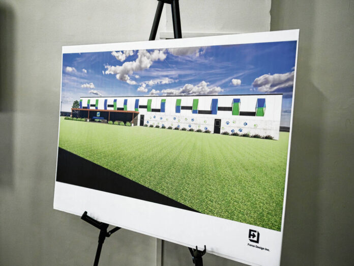 Mike Wolanin | The Republic A view of a rendering by Force Construction of their design for the new Columbus Animal Care Services building during a capital campaign kick off event to raise money for the new building at Bespoke Events and Experiences in Columbus, Ind., Tuesday, Aug. 12, 2025.