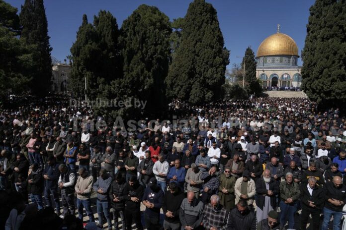 TEL AVIV, Israel (AP) — Tens of thousands of Muslims gathered under heavy security at the Al-Aqsa Mosque compound in Jerusalem for the first Friday prayers of the holy month of Ramadan, among them Palestinians who crossed into Israel from the West Bank.