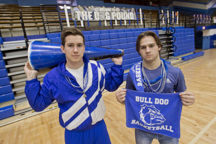 Columbus North student body president Ben Thompson, left, and Alex Davidson, right, coordinated the outfits North students wear when sitting in The Dog Pound, cheering on the Bull Dogs, pictured at Columbus North High School on Feb. 17, 2016.