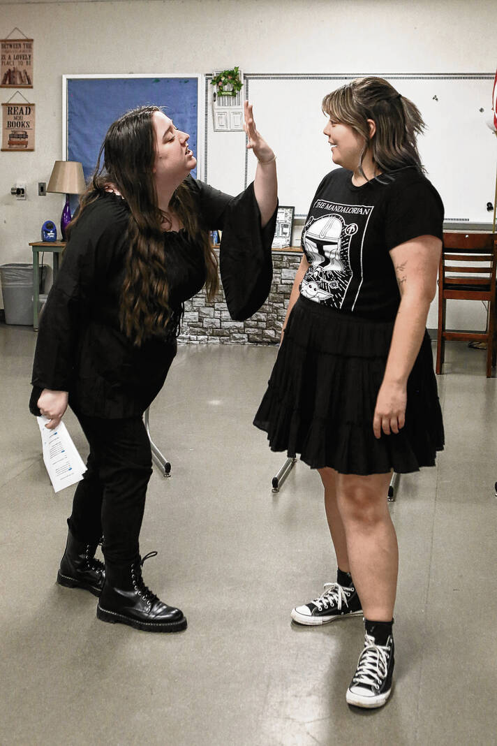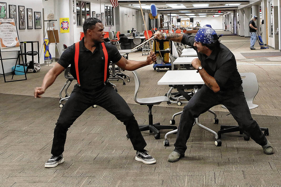 Carla Clark | For The Republic Jude Jean-Louis, left, as Gregory, and Jorge Sanchez, as Balthasar, act out a scene from the play Romeo and Juliet, during a rehearsal of the Mill Race Theatre Company’s presentation of Shakespeare’s Power Play at Columbus East High School in Columbus, Ind., Thursday, Feb. 19, 2026.