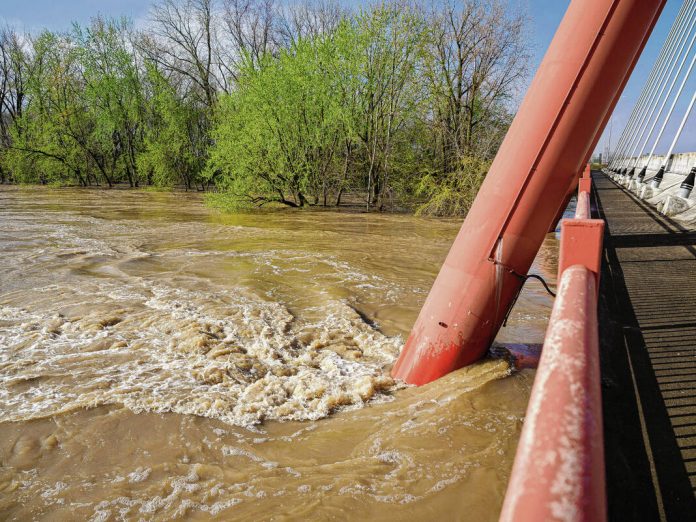 Mike Wolanin | The Republic A view of the ongoing flooding of East Fork White River from the Robert N. Stewart Bridge in Columbus, Ind., Monday, April 7, 2025.