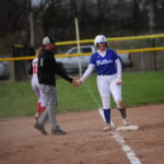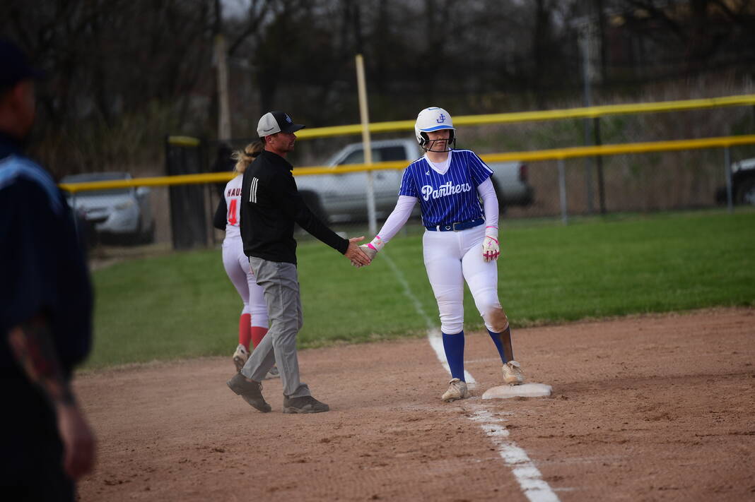 Jennings County’s Ryleigh Sporleder accepts congratulations from Panthers coach Bobby Willis after hitting a triple during a game against Hauser Tuesday at Hauser High School.