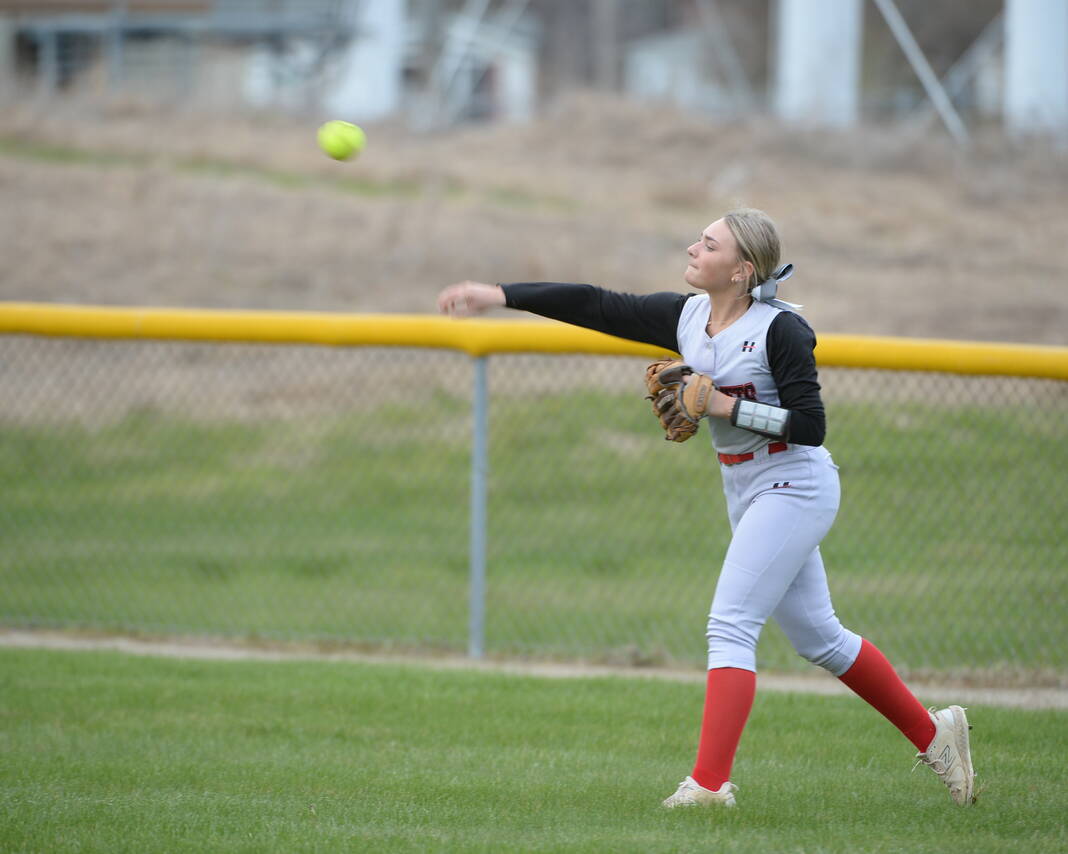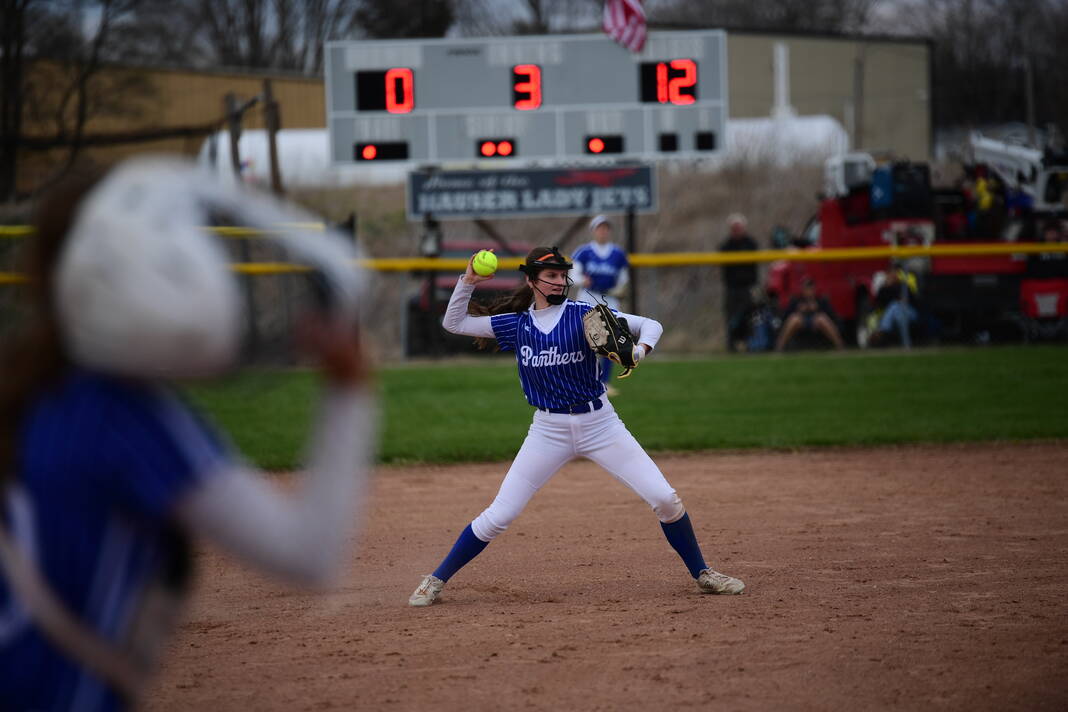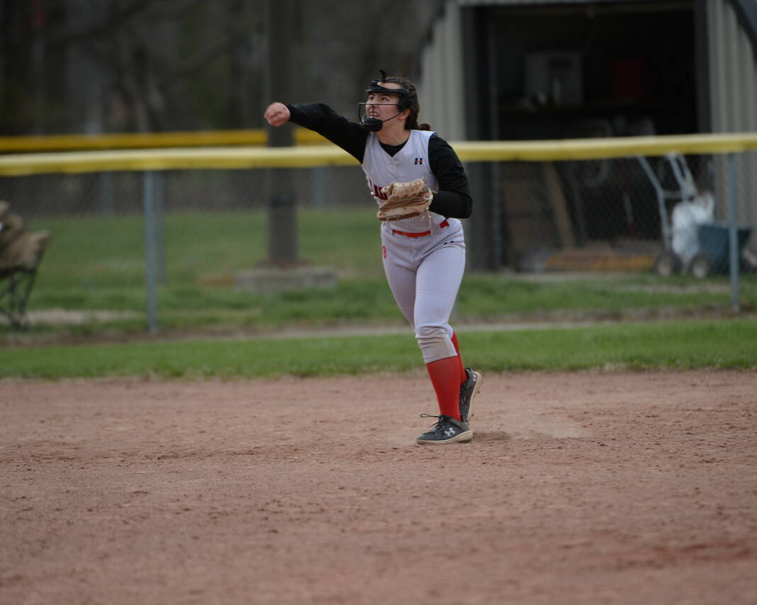 Hauser’s Allie Zapfe throws the ball back into the infield during a game against Jennings County Tuesday at Hauser High School.