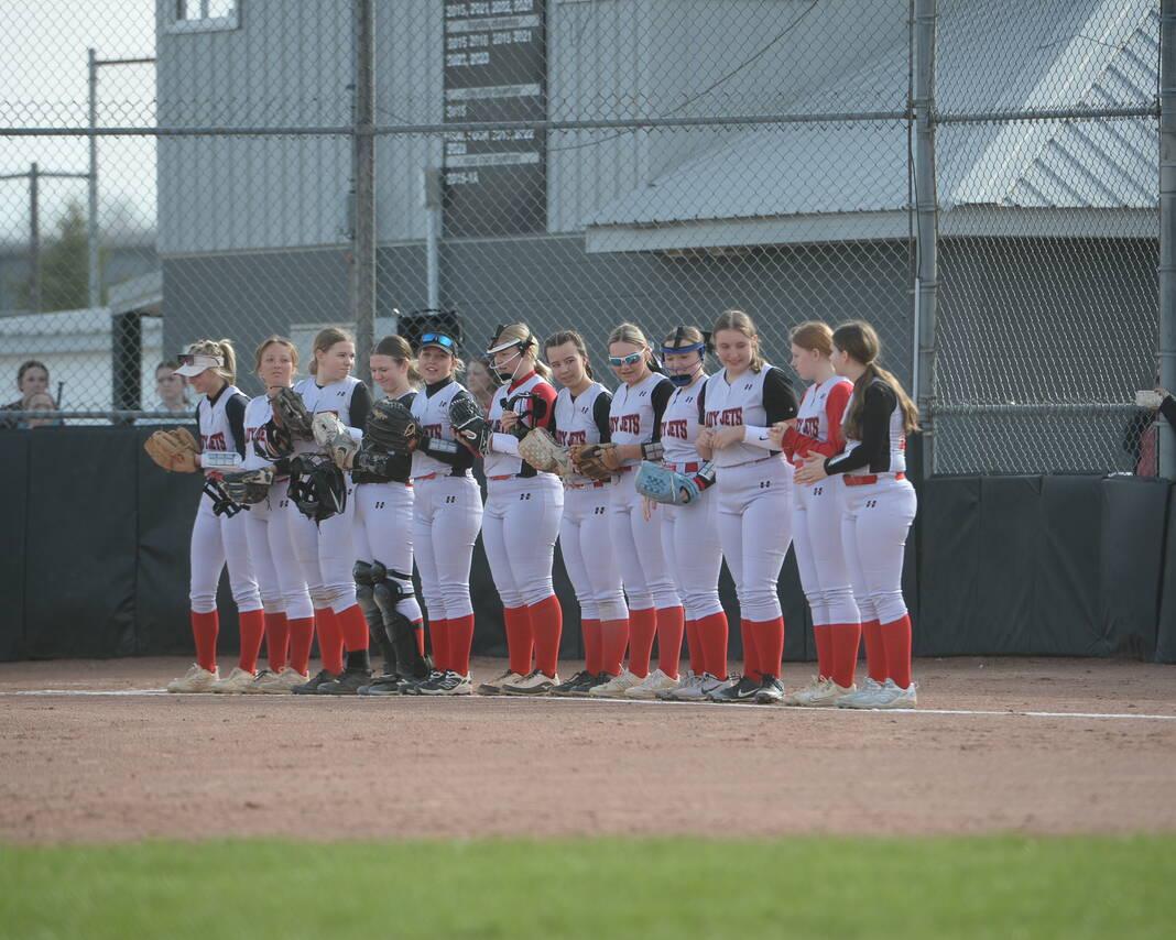 Hauser’s, from left, Karlieanne Brooks, Kinley Krise and Katie Robinson stand ahead of the Jennings County players during the National Anthem before a game Tuesday at Hauser High School.