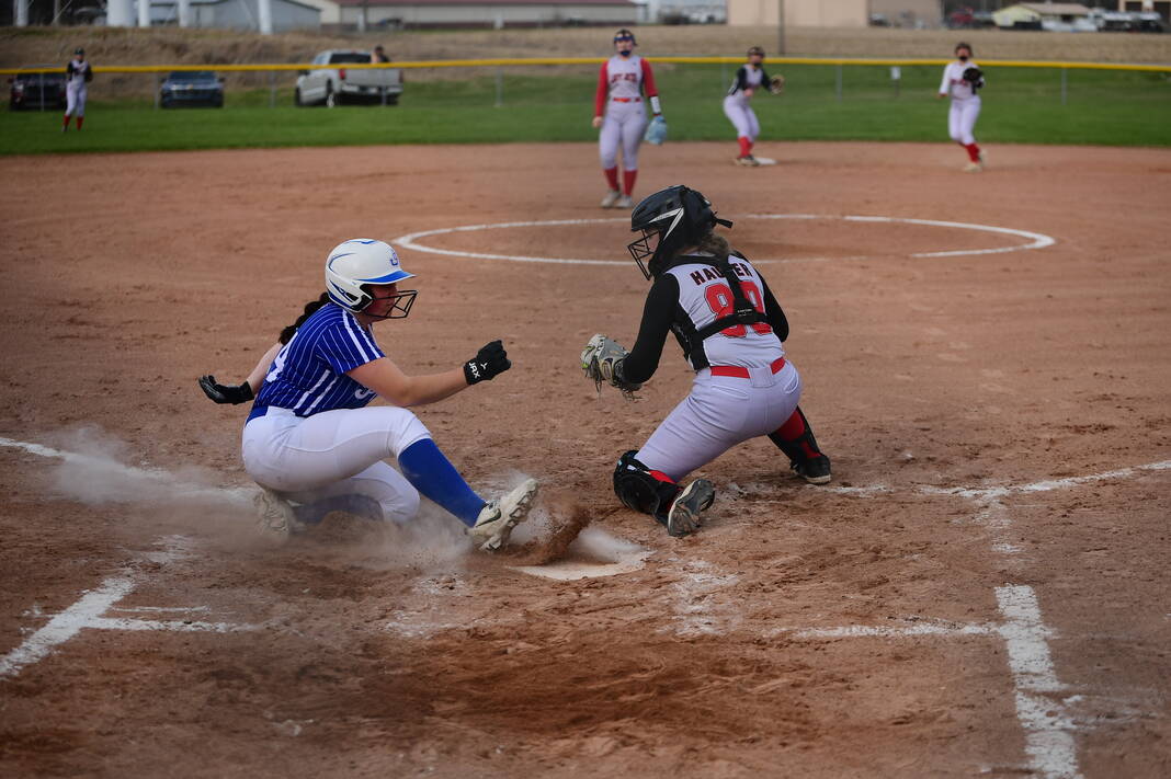 Jennings County’s Riley Byford slides across home plate before a tag by Hauser’s Katie Robinson during a game Tuesday at Hauser High School.