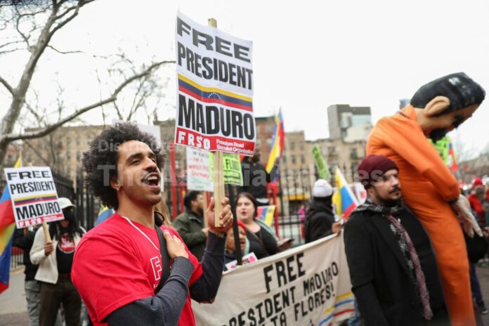 A group of demonstrators held Venezuela flags and signs saying “Free President Maduro.” They also shouted “No boots on the ground, no bombs in the air. U.S. out of everywhere,” denouncing U.S. military actions abroad.