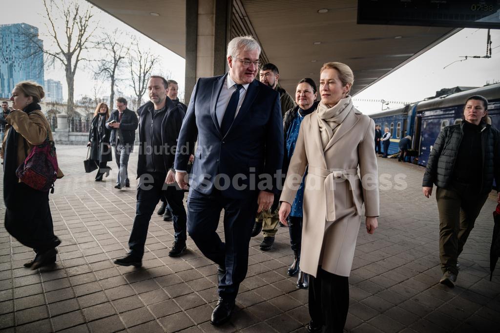 A group of 12 European foreign ministers, as well as numerous lower-ranking officials, arrived by train in the Ukrainian capital where they were welcomed by Ukrainian Foreign Minister Andrii Sybiha, who noted the “grim anniversary” of the shocking atrocities in Bucha.
