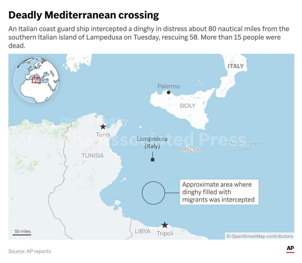 ROME (AP) — The Italian coast guard found 19 people dead and rescued 58 others after intercepting a dinghy filled with migrants that was in distress about 80 nautical miles from the southern Italian island of Lampedusa on Tuesday night.