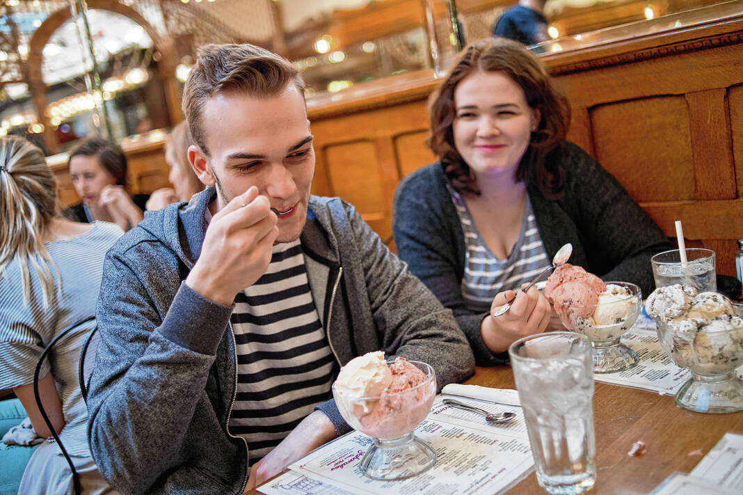 German student Tim Prohaska, left, eats ice cream while classmate Ennie Pahmeier, right, looks on at Zaharkos in downtown Columbus on March 30, 2016. German students traveled from Columbus’ sister city, Löhne, Germany, as part of an educational exchange program.